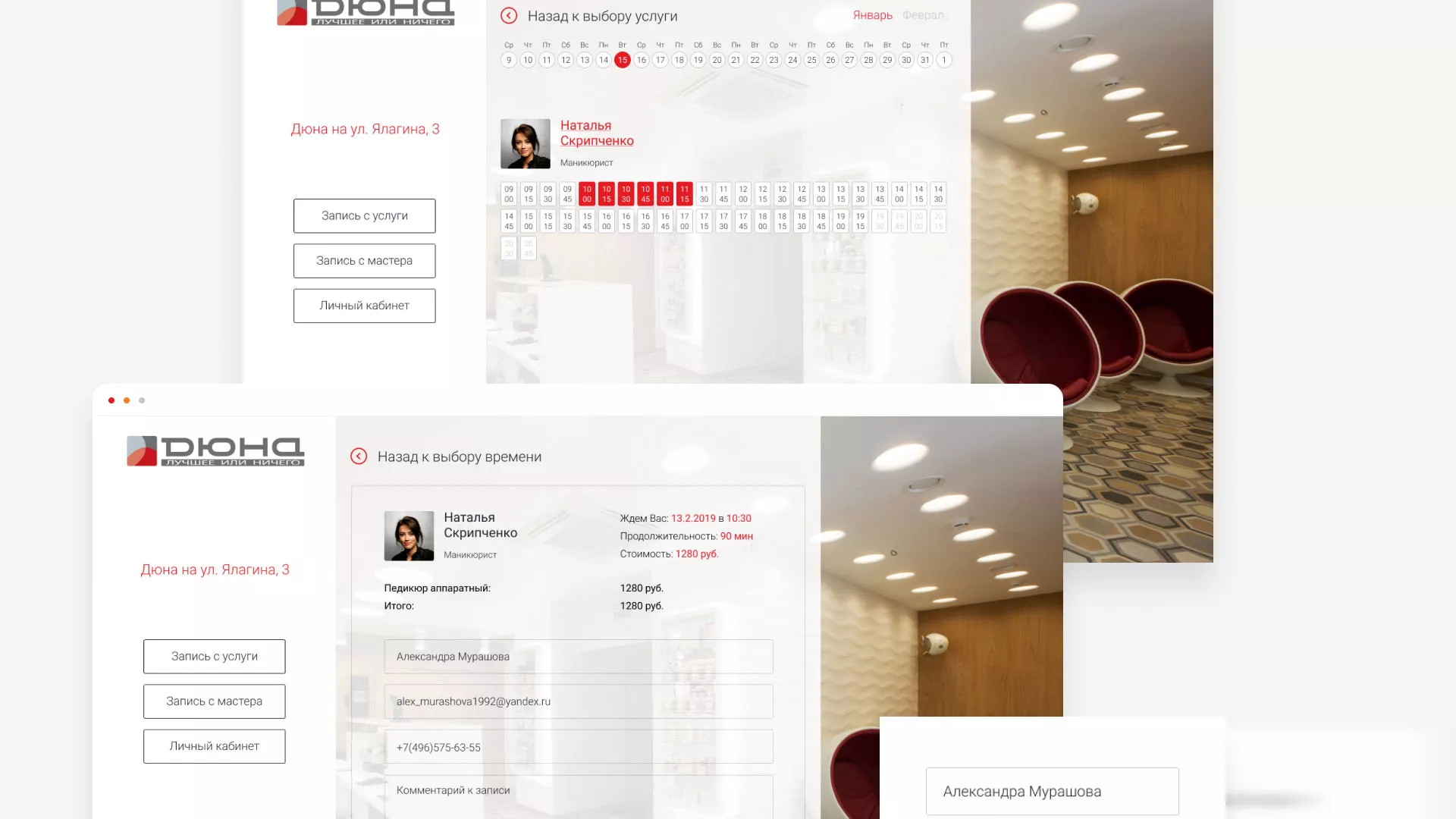 В разделе «Личный кабинет» содержатся все текущие записи в салоны красоты в Киришах, с возможностью их отмены. Также, здесь можно редактировать свои персональные данные, ознакомиться с историей записей и видеть бонусы и акции салонов красоты.